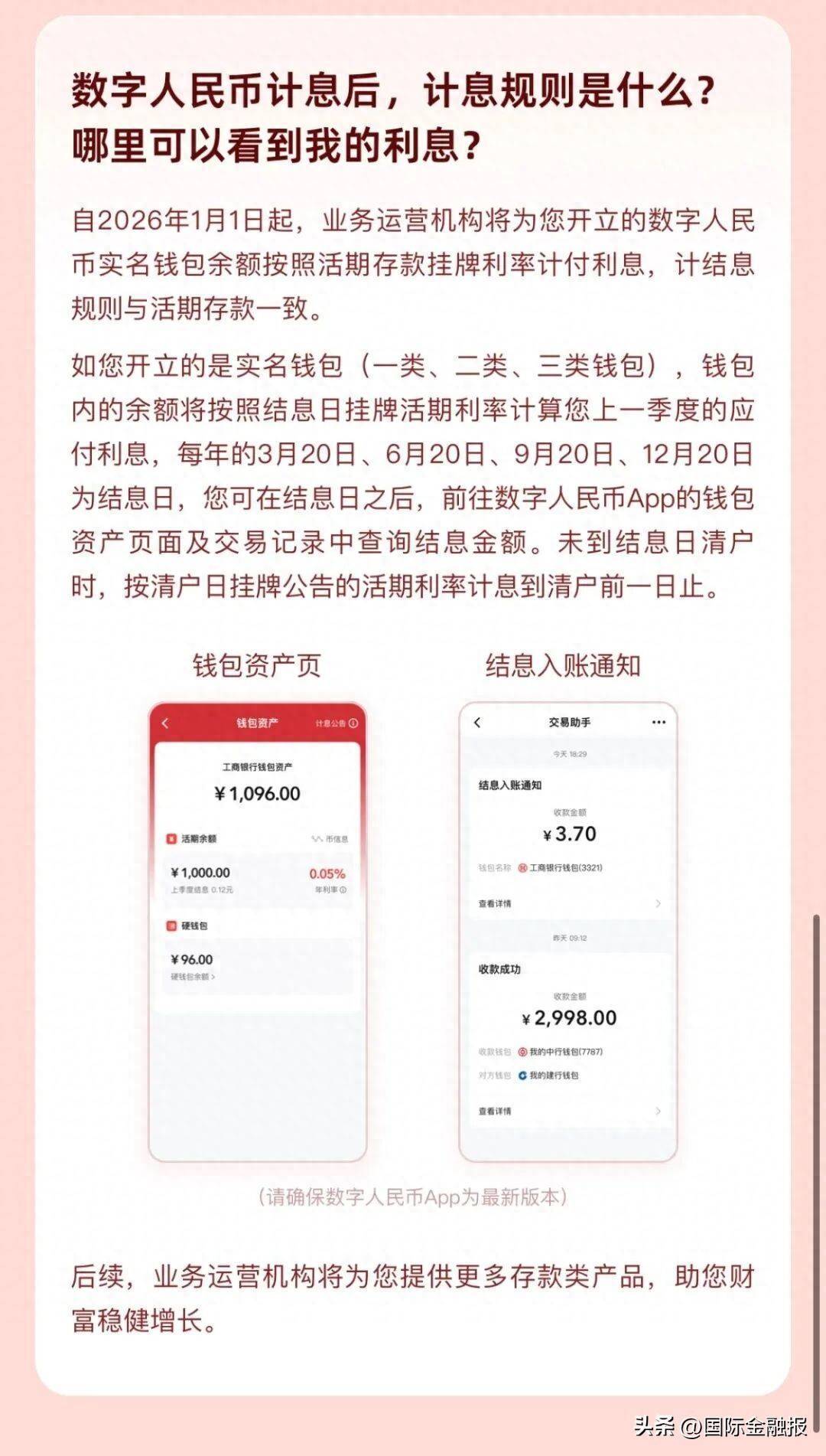 进款货币型2.0版的数字东谈主民币与现款型1.0版的数字东谈主民币比较,一个显贵的变化是实名数字东谈主民币钱包余额按照银行活期进款挂牌利率计付利息,计结息规章与活期进款一致,按照结息日挂牌活期利率盘算上一季度的应酬利息,每年的3月20日、6月20日、9月20日、12月20日为结息日,现在银行活期进款挂牌年利率为0.05%。