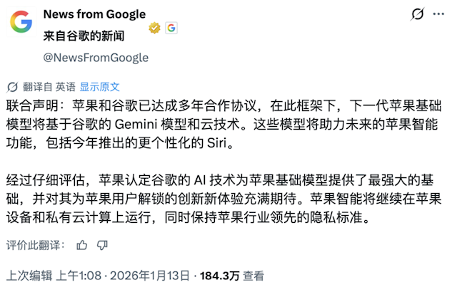 快科技1月13日音信,苹果与谷歌当天和洽告示,Gemini架构将为改日Apple Intelligence功能的研发提供时期相沿,其中就包含野心于年内上线的更具个性化的Siri版块。