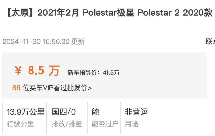 如今,极星在中国的二手车价暴跌。证据中原二手车网的信息,2021年上牌的2020款极星2售价照旧降至8.5万元,其新车提醒价为41.8万元,跌幅达33.3万元,比情况相同、行驶里程多5万公里的蔚来EC6还低1.48万元。