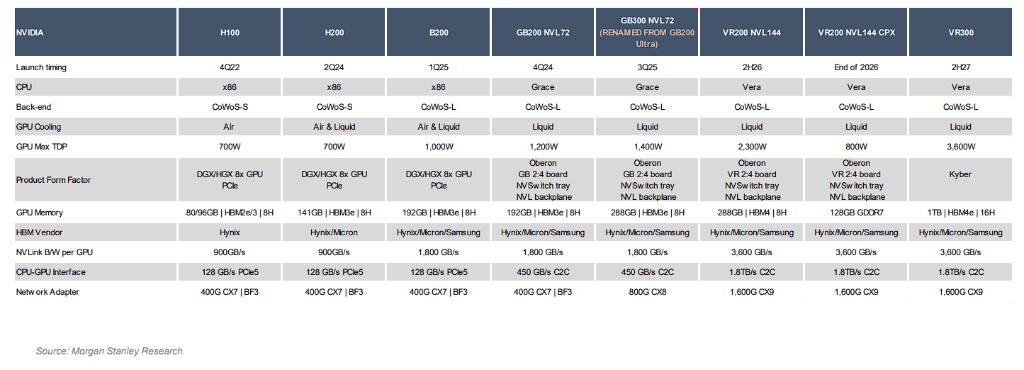 AI做事器机架需求爆发式增长大摩在解说中明确指出,AI硬件的增长能源正从H100/H200期间,转向由NVIDIA的GB200/300(Blackwell平台)及后续的Vera Rubin(VR系列)平台所初始的新周期。