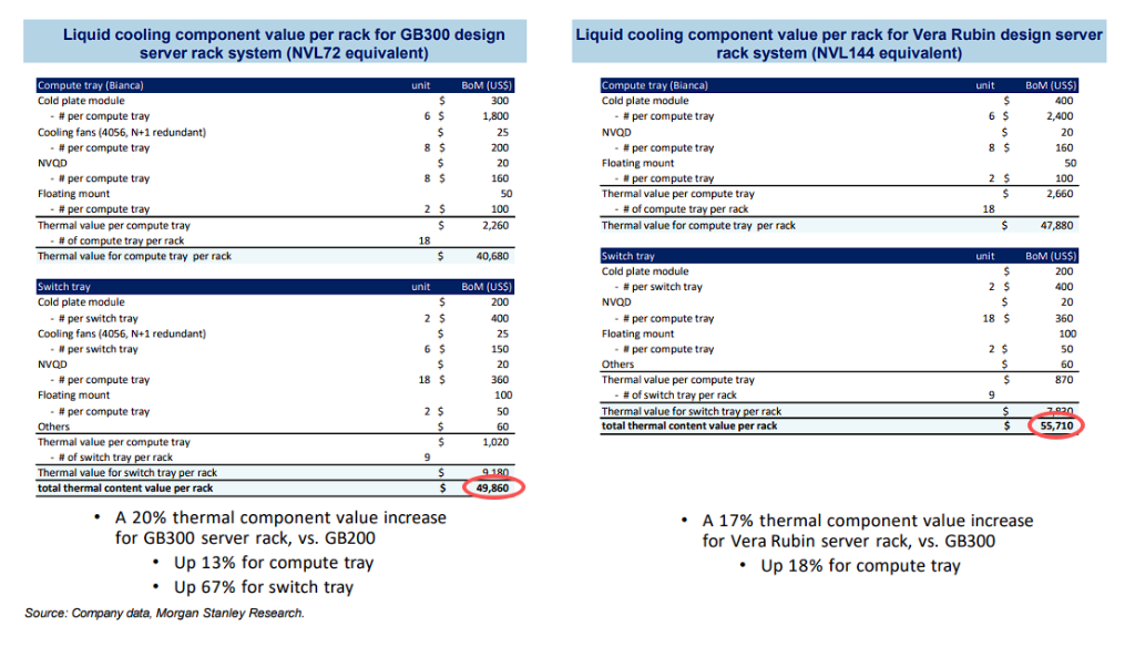 大摩称,这光显地标明,液冷产业链中的冷板模组、冷却电扇、快速勾通器(NVQD)等重要部件供应商将平直纳益。