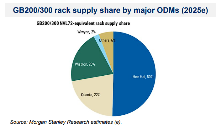 解说强调,跟着机柜诡计从单个GPU升级转向总共机架系统(Rack)的集成诡计,领有建壮整合才和洽结识托付纪录的ODM厂商,如广达(Quanta)、富士康(Foxconn)、纬创(Wistron)和纬颖(Wiwynn),将在GB200/300机柜供应中占据主导地位。