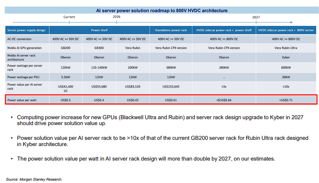 大摩展望,到2027年,为Rubin Ultra机柜(罗致Kyber架构)诡计的电源处置决议,其单机柜价值将是现时GB200做事器机柜的10倍以上。同期,到2027年,AI做事器机柜中每瓦功耗对应的电源决议价值,也将比现阶段翻倍。