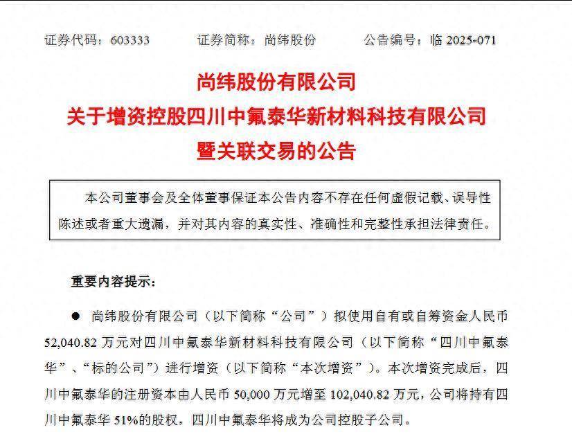 公告夸耀,尚纬股份拟使用自有或自筹资金东说念主民币52,040.82 万元对中氟泰华进行增资。本次增资完成后,中氟泰华的注册本钱由东说念主民币 50,000 万元增至 102,040.82 万元,公司将捏有四川中氟泰华 51%的股权,四川中氟泰华将成为公司控股子公司。
